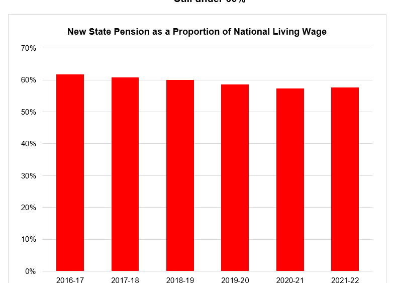 One other way to think about the new state pension is to compare it with how much you would earn from a 35-hour week at the minimum wage, which is £311.85. As the graph illustrates, that leaves the new state pension at less than 60% of the theoretical NMW weekly pay.