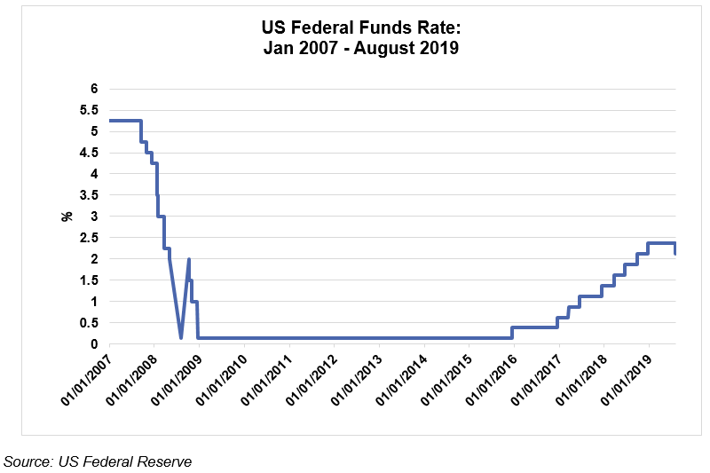 The new 0.25% cut announced from the beginning of August was widely anticipated, although there were some investors who had forecast a 0.50% reduction. The backdrop to this cut, however, is very different from that of December 2008. Now the US economy is close to full employment and, while growth did cool in the second quarter, it is still running year-on-year at 2.3%. In other times, such conditions would not prompt a rate cut. The central bank is acting now because it wants to prevent the economy slowing any further, at the end of an unusually long period of growth.