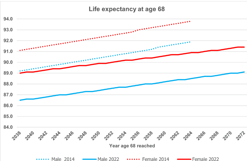 The next review is due by July 2026. As the government has promised to give at least a decade’s notice of any change, there is little time if 2037–39 is to be chosen. However, it now seems unlikely that a 2030s change will happen as illustrated by the graph above. When the first review was issued (in 2017), it drew on ONS projections (with a 2014 base year) which said that by 2038 a 68-year-old male and female could expect to live another 21.2 years and 23.1 years respectively. The latest ONS data (2022 base year) has cut those projections to 18.5 years and 21.0 years.
