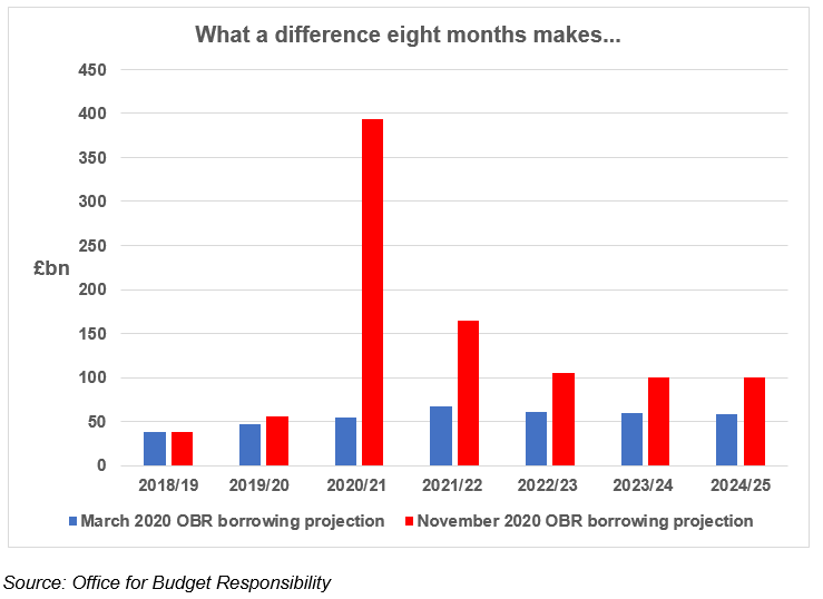The OBR’s November calculations were dramatically different from those it produced in March. Whereas in spring the OBR had forecast that the government would borrow £55bn in the current financial year (2020/21), by November that figure had risen to £394bn – the tall red column on the graph. Over £280bn of that extra borrowing can be attributed to the costs of dealing with the pandemic. In 2021/22, a further £55bn will be spent dealing with Covid-19, pushing up that year’s borrowing to nearly £165bn.