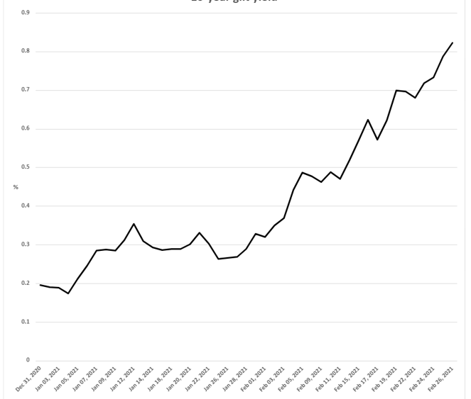 The first two months of 2021 gave a perfect illustration of how great the divergence can be. The interest yield on 10-year government bonds (gilts), a widely used benchmark, more than quadrupled in the UK from 0.196% at the start of the year to 0.823% at the end of February. Across the Atlantic, the yield on 10-year US Treasury bonds also jumped, from 0.916% to 1.407%. In both instances base rates were unmoved.There were various reasons put forward for the upward movement, but many focused on investors’ fears that inflation could pick up as economies recovered from the pandemic.